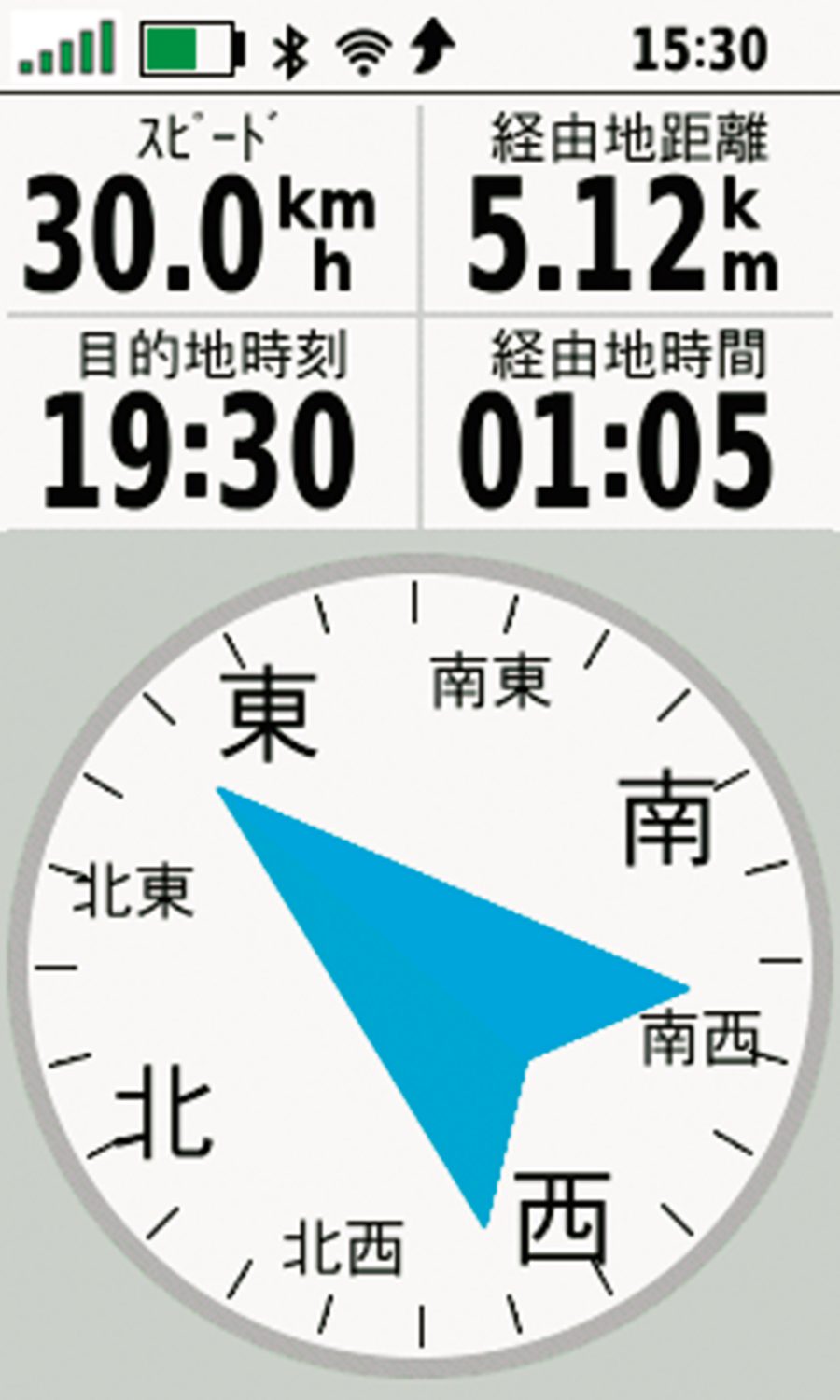 ルートデータを取り入れたナビゲーションを行なうと、目的地、経由地までの距離などを途中で把握でき、さらに目的地の方向をコンパスが示してくれる。
