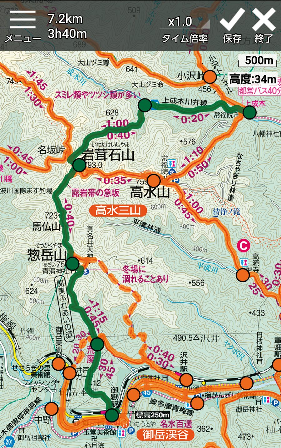 - 地形図ベースの登山地図は、コースタイムや水場の情報を表示