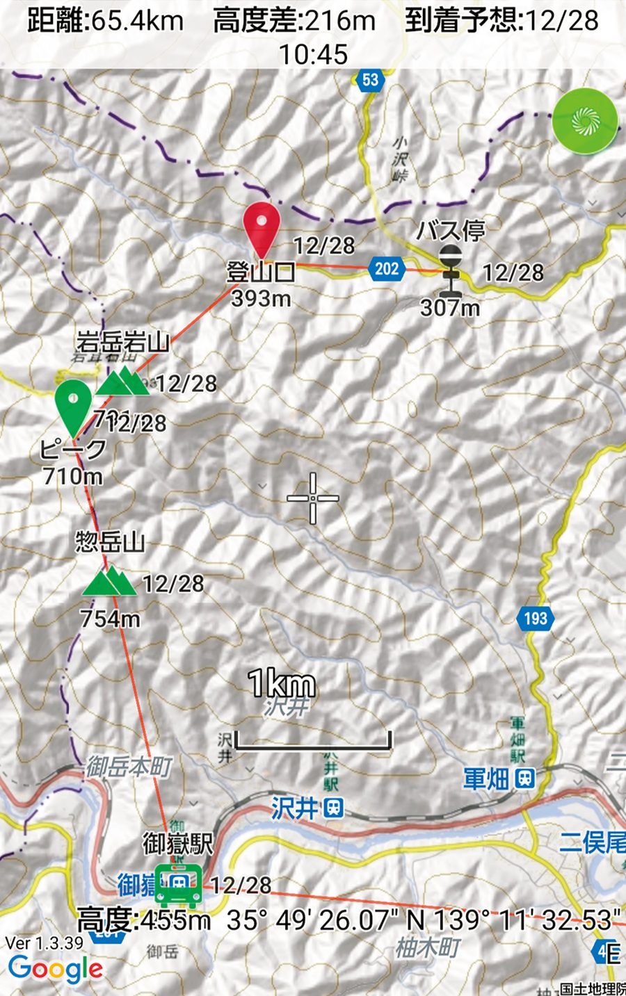 ⑥登山開始ボタンを押すと、ダウンロードされた地図を表示