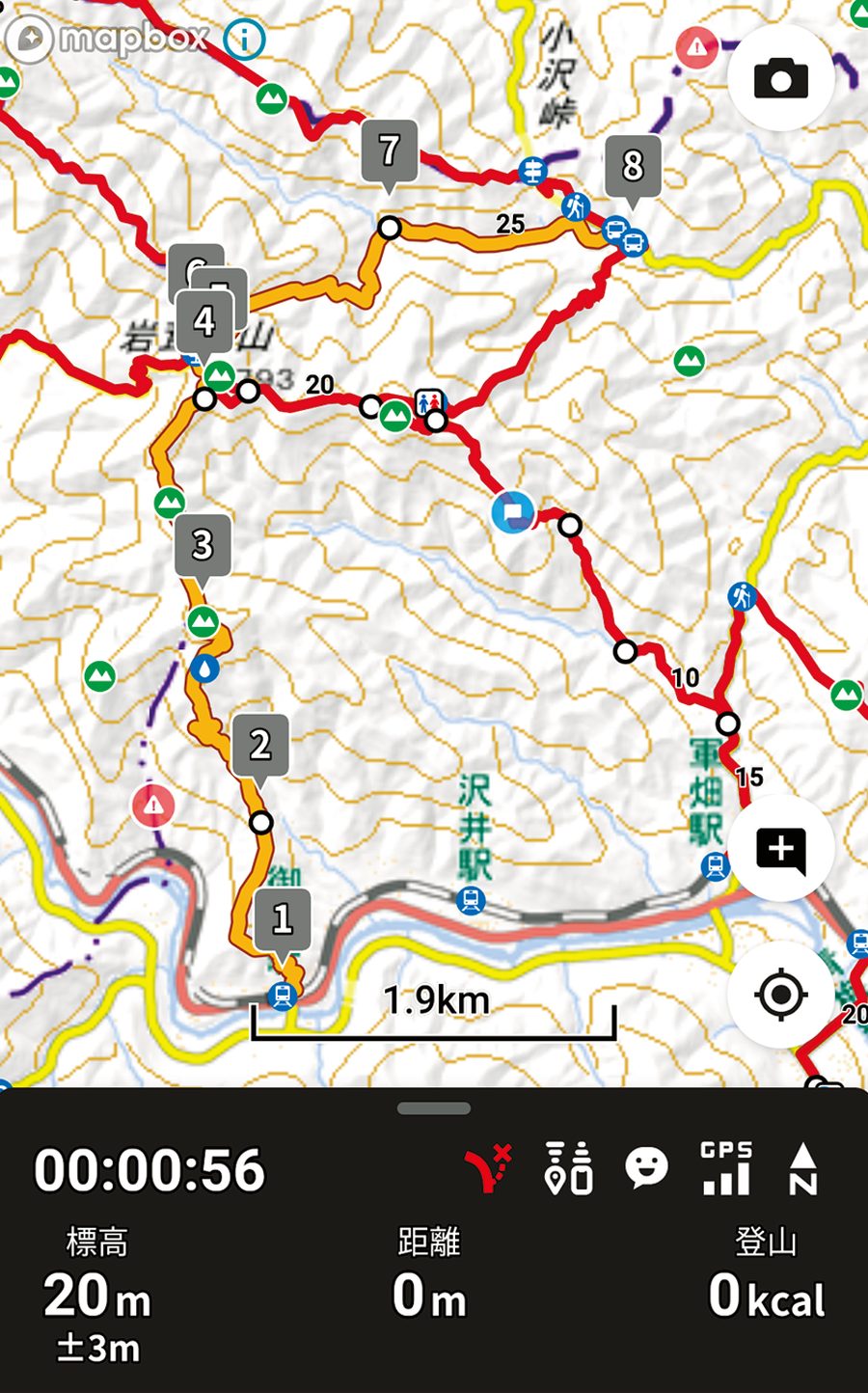 ⑦現在地ボタンを押して表示させ、登山開始ボタンで記録スタート