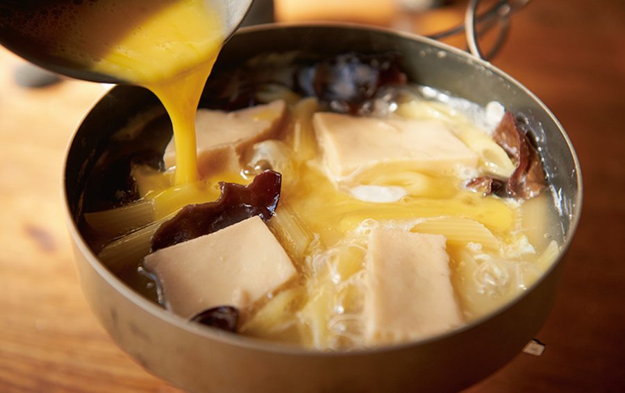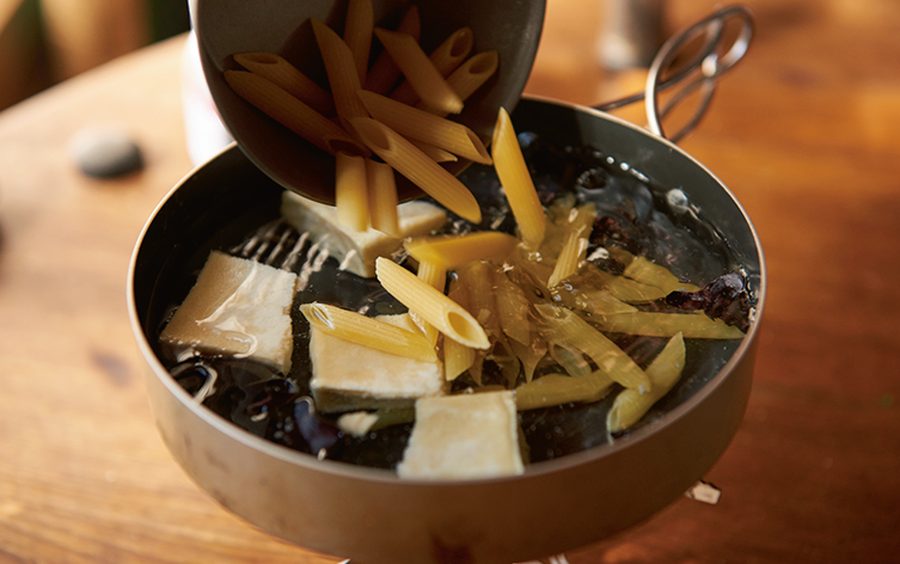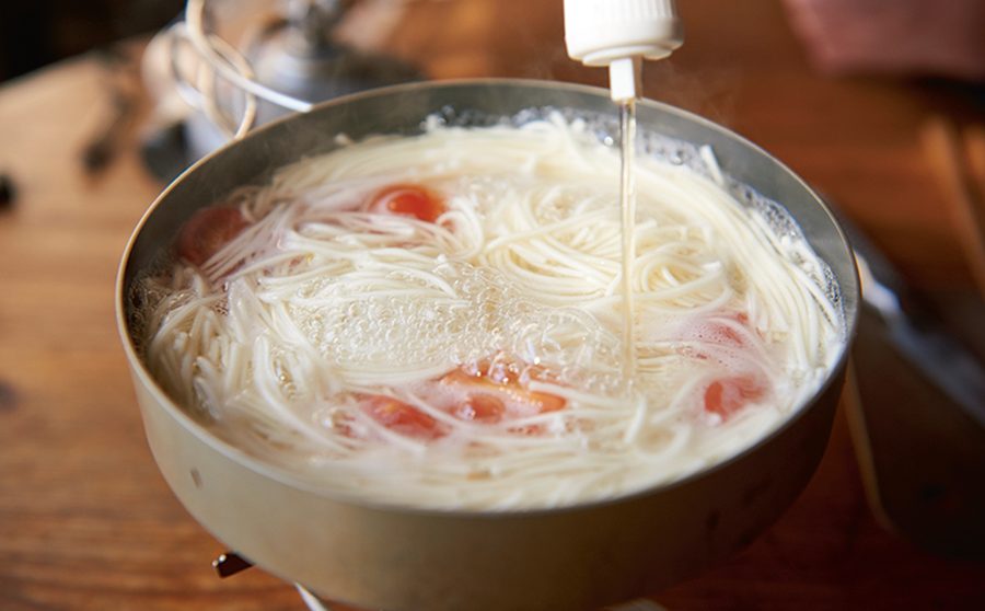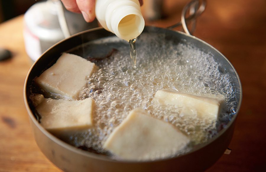 加熱時間の短い酢は酸味が強めで煮崩れを防ぐ作用がある。長時間火を入れると酸味は和らぎ、タンパク質をやわらかくしてくれる。山での調理は基本的に短時間だが、火を通す時間で酸味の調整は可能。入れるタイミングを先か後か好みで変えてみよう。