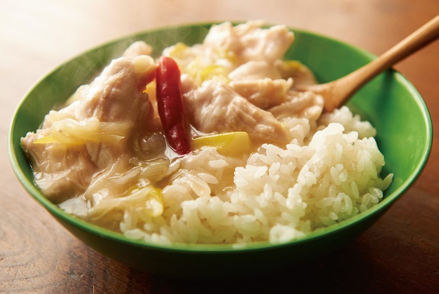 【3】かき混ぜながら調味料を加えてトロみをつける。皿にご飯を盛り、餡掛けをかける。ご飯は炊いてもいいし、アルファ米、コンビニおにぎりなどでも可。