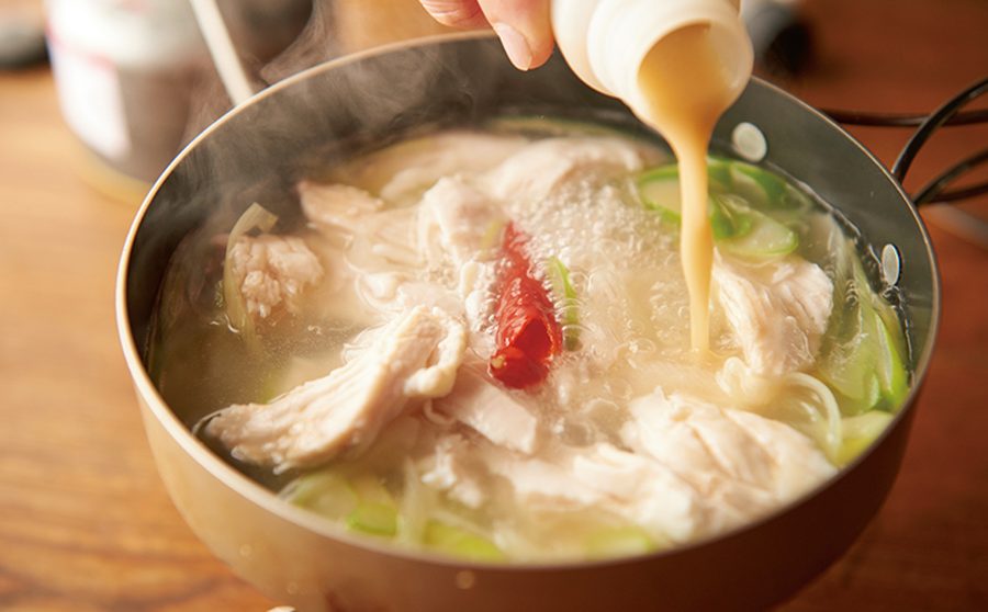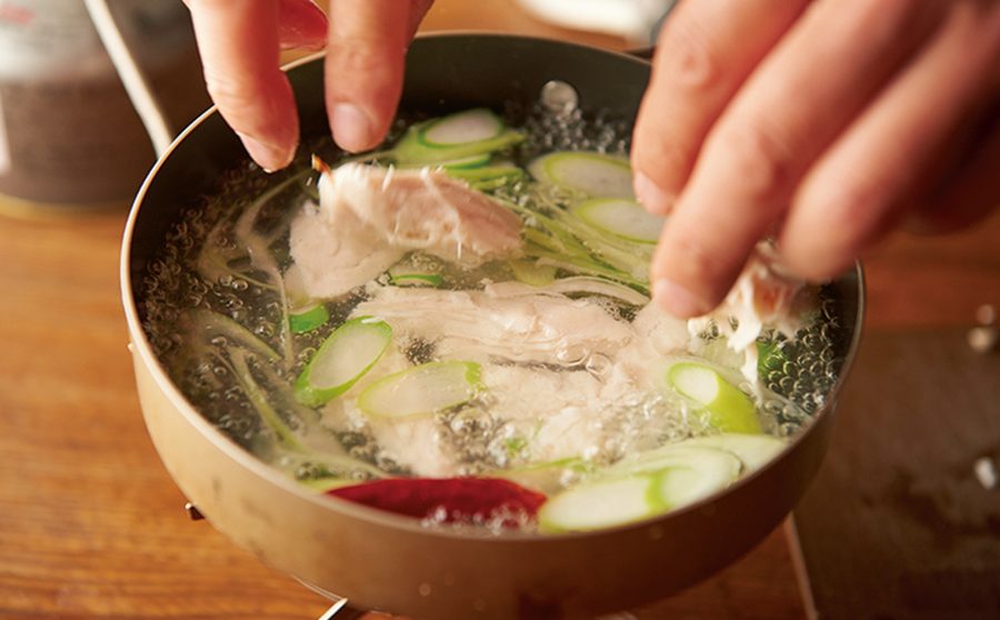 【2】チキンを手で一口大に割いて鍋に加え、3分ほど中火で煮込む。