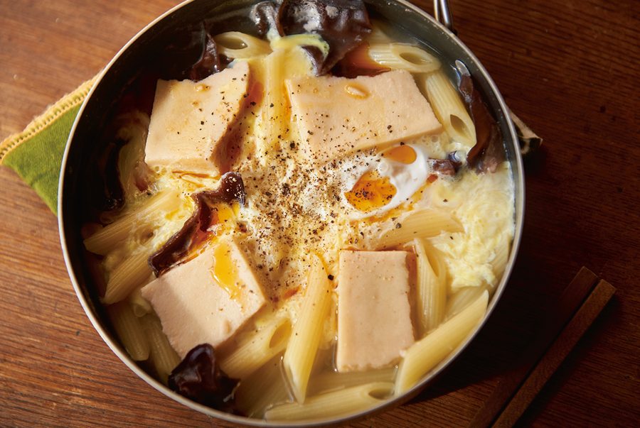 【1】鍋にお湯を500ml沸かし、砕いたキクラゲと高野豆腐、ショウガ、パスタを入れて中火で煮込む。