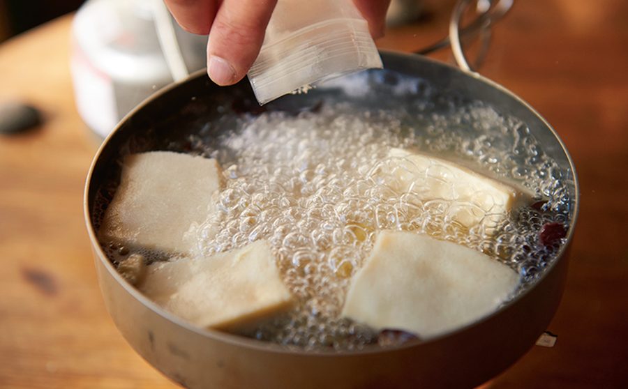トロみのあるメニューは寒い山でも冷めづらく魅力的。しかし、片栗粉はダマになったり、水に溶いてから加える手間があって面倒だ。そこで、この「とろみちゃん」。水に溶かずに、そのまま加えてかき混ぜるだけでトロみがつけられる優れものだ。