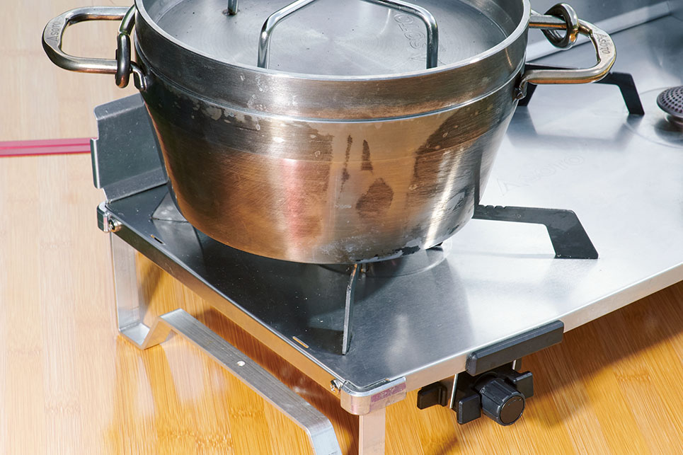 磨きのステンレスが美しい天板は煮汁をこぼしても簡単に掃除ができる。そのうえ、金属好きなメンズの琴線にも触れるもの。線の細いイメージのデザインながら、おでん満載の鍋のみならずダッチオーブンも余裕で支えてくれる。マイクロレギュレーターを搭載し、低温時や連続使用時の火力低下もなく、コトコト料理にも最適。