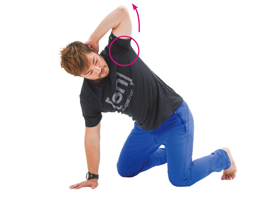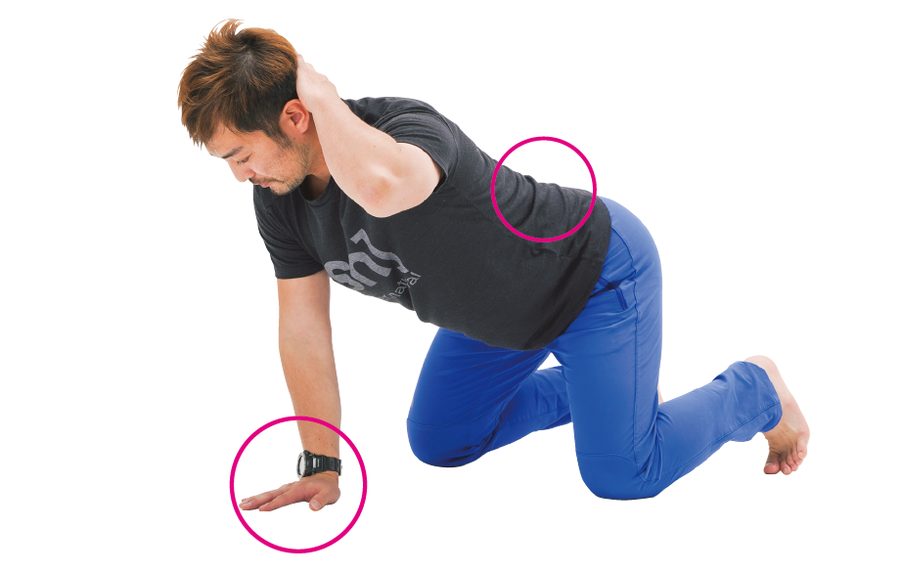 ❶四つん這いの態勢から片手の平を後頭部に添える。背骨を高い位置でまっすぐにし、反らないようにする。このとき腰の位置を意識する。