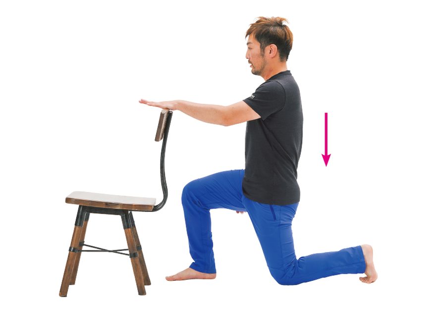 ❶片足を前に出し、両膝を軽く曲げる。このとき両足の膝ができるだけ一直線になるようにする。足を出した側の反対の手を前に突き出しイスや壁に添える。引いた足側のモモを意識する。