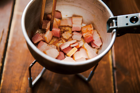 ①鍋に厚切りベーコンを入れたら弱火で炒めて脂を抽出し、さらに刻んだニンニクを入れて香りを出す。