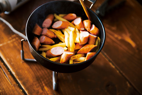 ②ポテトに火がとおったらカットしたソーセージを炒める。