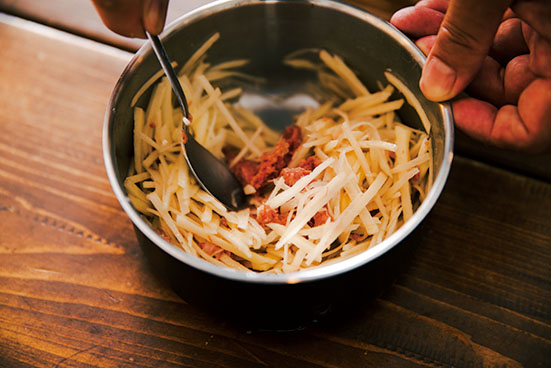 ①細い千切りにしたジャガイモにコンビーフとコショウを混ぜておく。