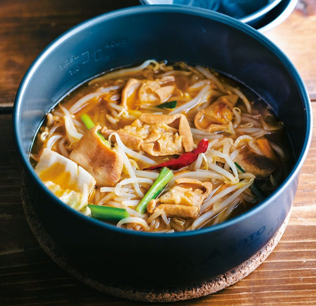 ちょっと肌寒くなってくる秋キャンプにもピッタリな鍋料理。水と野菜を入れて、その上にモツをのせて火にかけるのみという手軽さも魅力。