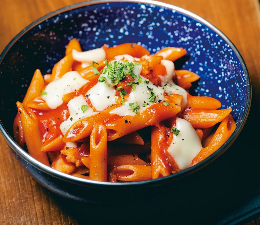 ペンネチーズ、トマト、ベーコンのマリアージュ。コンビニ食材のみで作ったとは思えないお洒落なショートパスタ。お好みでタバスコも。