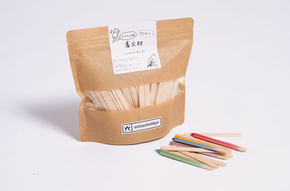 アイスの棒を焚き付けにするという新しい発想。カラフルなロウが塗られ、“あたり”などのコメントが数本焼き印されていて、楽しませてくれる。障がい者自立支援の商品でもある。