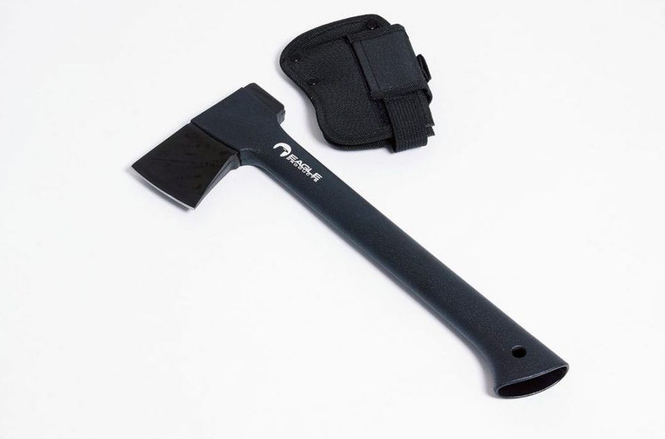 刃の厚みがあり、無骨ながらも軽量で女性でも扱いやすい。この1本があれば、薪割りからフェザースティックまでこなせる。ヘッドカバーが付属され、持ち運びの際も安心安全だ。