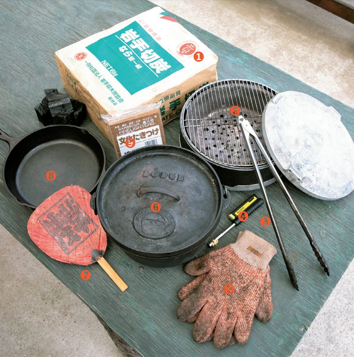⑧スキレット。炭火を利用した調理では一般的なフライパンは熱で変形してしまう場合があるので、鋳鉄製のタイプが安心。