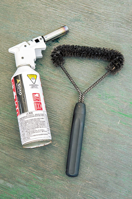 網にこびりついた焦げを落とすブラシ(右)と、急な火熾しに活躍するトーチ(左)。スムーズな炭火料理にはぜひ欲しいアイテム。