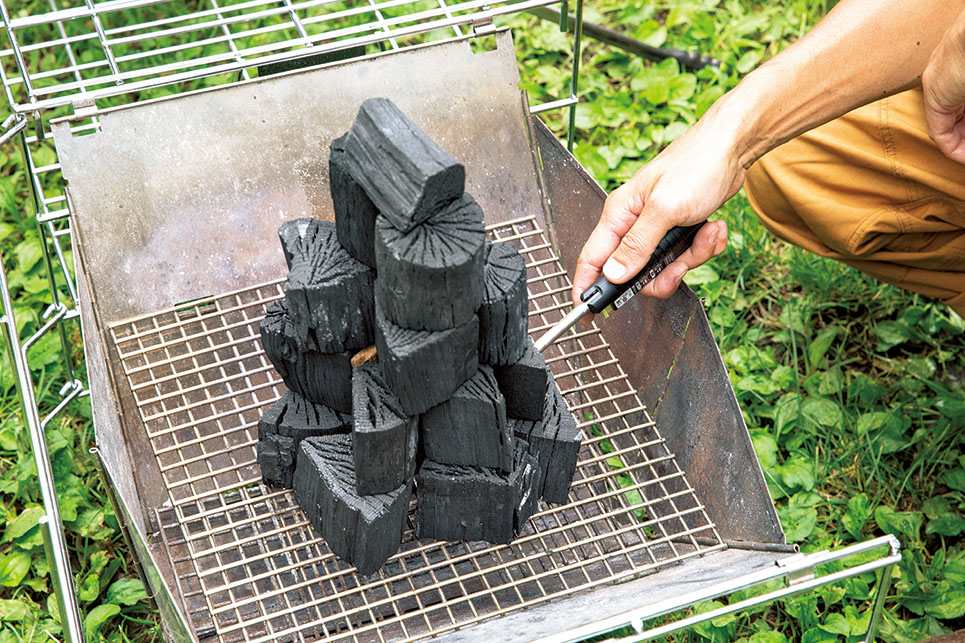 きれいに炭が積み上がったら、着火口までの柄が長いライターを使ってタワー中央にしのばせた着火材に点火。炭を崩さないように気をつけよう。