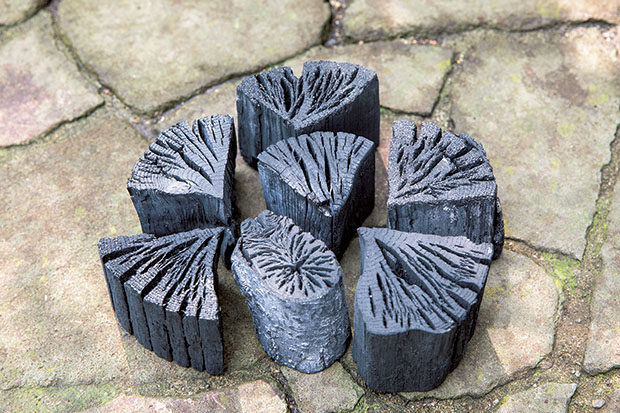 小雀さん愛用の岩手切炭。火付きがよく温度が安定し、イヤな臭いもなく、灰も少ない。大きさもほぼ均一で火力の目安もつけやすい。