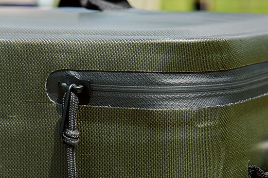 防水性と耐久性に優れるナイロンTPUラミネート生地を使用したソフトクーラー。密閉性の高い止水ジッパーを採用しているため、冷気が逃げにくい。350㎖缶が14本入るサイズ。