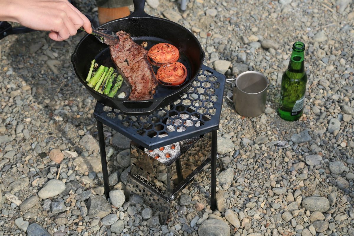 昨今のソロキャンプブームの影響で、多種多様な焚き火台が生まれる中、どんどんとコンパクトに進化を続けています。スマートで設営しやすく、片付けも楽ちんと申し分ない。かと思いきや、焚き火料理に気合い入れたいタイプの人間にとっては、使える調理道具に制限があることや、同時に複数の料理をすると、いささか不安定だったらり、スペースが足りなかったりと、悩ましいポイントも多々ございます。