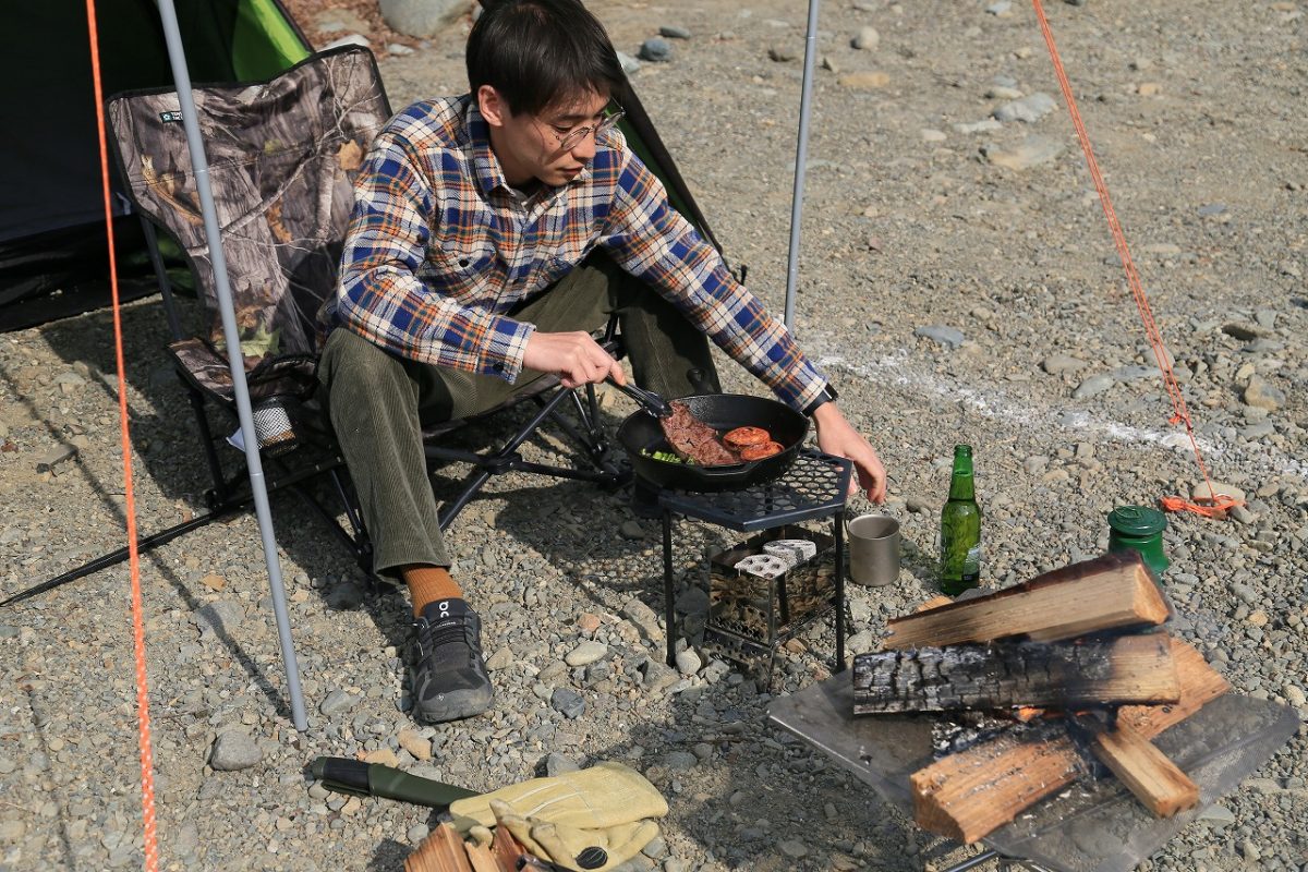 「凝った料理はしないですが、色々なものをつまみながらダラダラ過ごしたいんです。ソロキャン用の焚き火台だとゴトクに余裕がないので、料理を作りながら、トングの置き場所に困ったり、二品目作ってる間に他のつまみが冷めちゃったりと、バタバタしてること多いんです。同時に2品調理できるのは本当にありがたい。