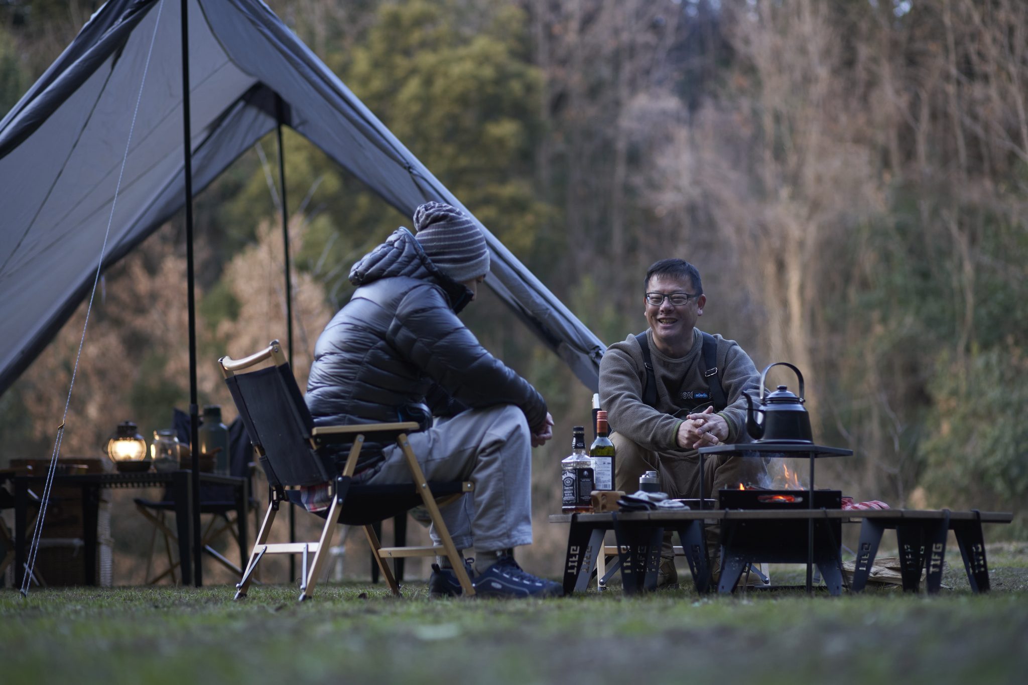 グラスを傾けながらの森山さんとのキャンプギア談義。100のオンライン会議より、リアルに焚き火を囲むことことで生まれる、新たな創作アイデアが溢れる。アウトドアギア開発の基本である、「自らが必要とするものを世に生み出す」ということを彼はなによりも大切にする人だった。自画自賛を繰り返しながら、おたがいに新製品への自信を深めた夜だった。