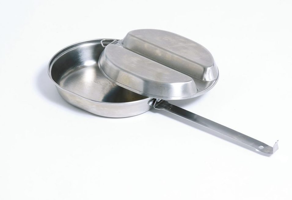 フライパンとプレートがセットになっているステンレス素材のクッカー兼食器。戦時中に使われていたものが現代版として復刻。無骨な見た目からソロキャンパーに人気だ。