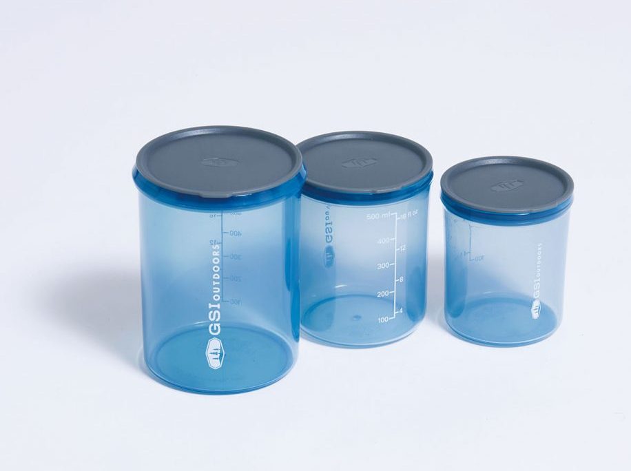 ポリプロピレンのリサイクル素材で生産された目盛付きの食品保存容器。登山やキャンプで中身を消費したあとは、3つを入れ子式でひとつにスタッキングして持ち帰ることができる。