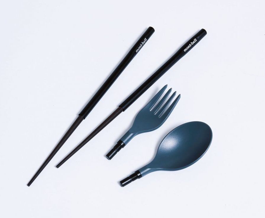 柄の部分に軽量で優れた強度を持つアルミニウム 合金を使用したカトラリーセット。ねじ込み式で箸、スプーン、フォークをそれぞれ使い分けることができる。