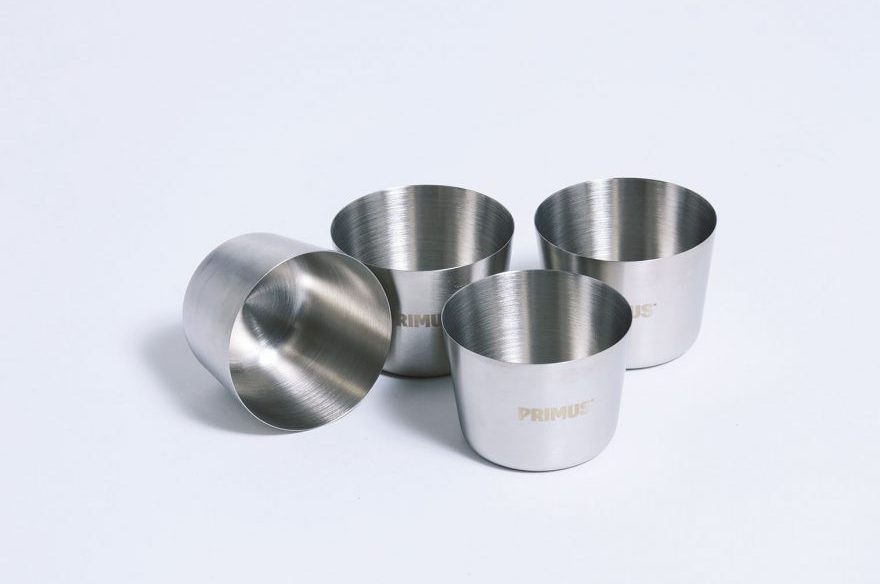 ステンレス製ショットグラスの4個セット。登山などで荷物は減らしたいがアウトドアで仲間と晩酌を楽しみたい人には欠かせないアイテム。付属の袋に重ねて収納できる。