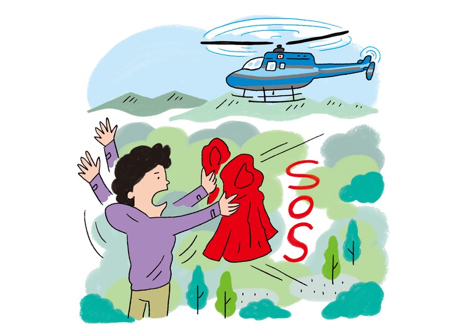 地上の救助隊とは、まず救助現場で出会わなければならない。登山道やわかりやすい場所にいればよいが、道から外れていたり、視界が開けていない場合、出会うタイミングを逸してしまう。救助隊員も注意深く探しているが、救助要請した側も、姿を確認できたら声を出したり、ホイッスルを鳴らすなどして位置を伝えよう。