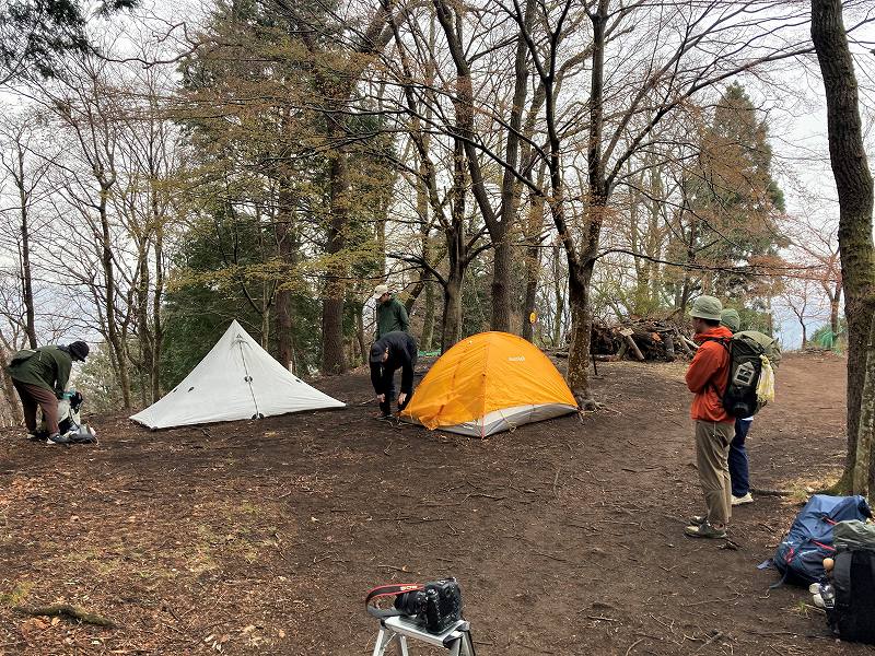 ロングトレイルをよく歩かれるという、「山と道」スタッフの中村さんが持ってきてくれたテントが唯一の非自立式テントだったので、先に場所を固定し、その後にツエルト、半自立式テント、最後に自立式テントの位置を決めてセット完了。イメージどおりに絵づくりができ、編集部アベ、満足。