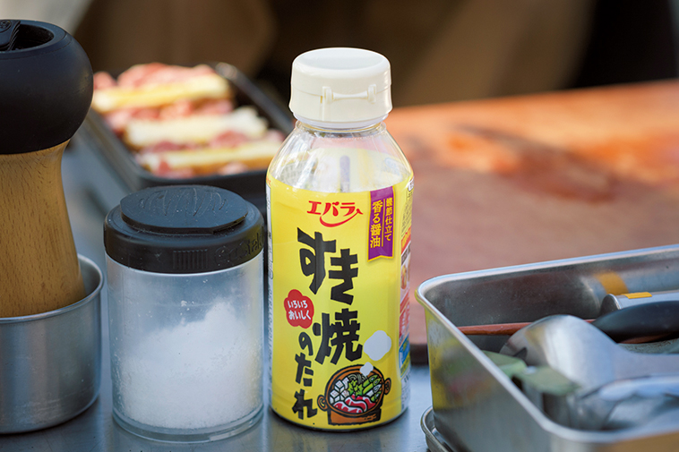市販のすき焼きのタレは、なかなか侮れない。併せ調味料と考えると、いろいろな調味料を持っていく手間が省けるので重宝する。親子丼や牛丼にも使える。