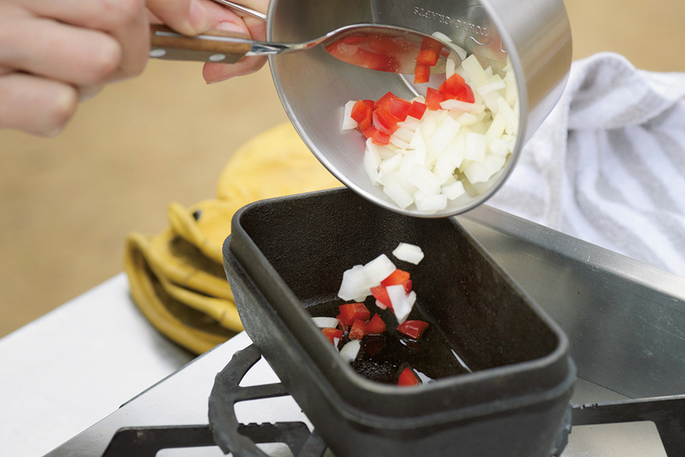 1.メスティンを熱し、オリーブオイルを敷いて、玉ネギとパプリカを中火で炒める。