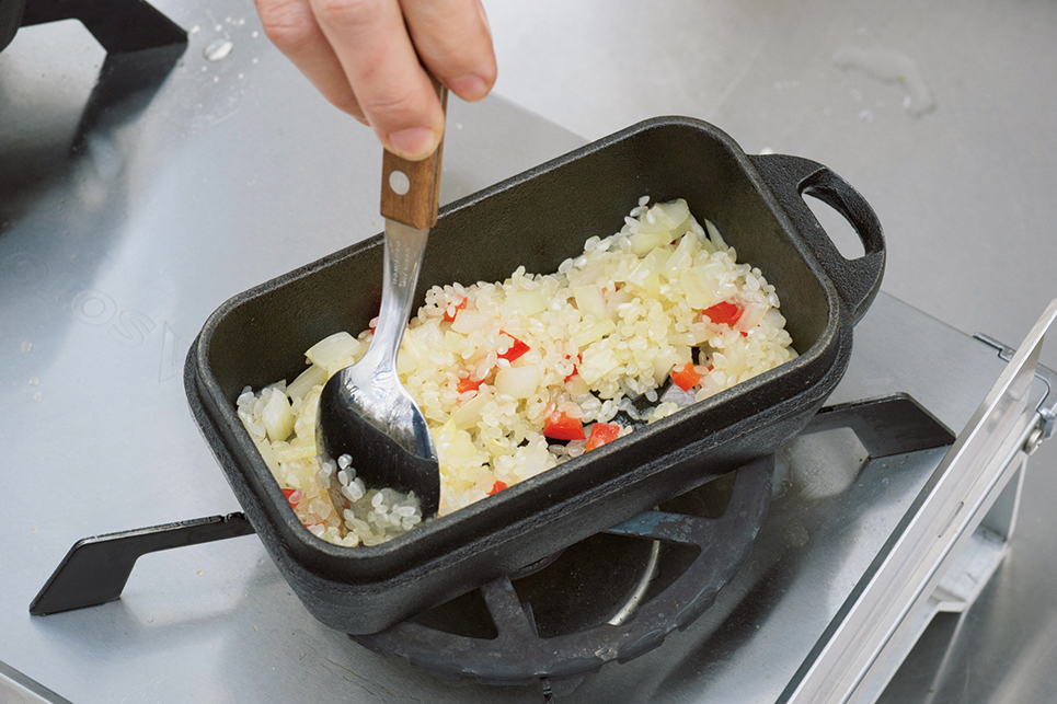 2.しんなりしてきたら米を洗わずに入れ、透き通ってくるまで炒める。