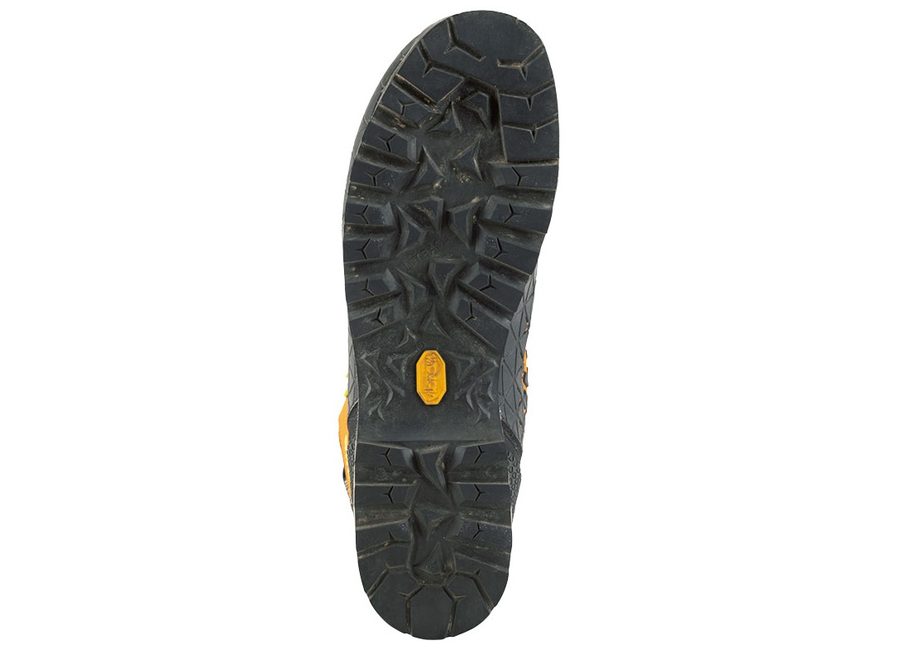 かかとにはコバ(窪んだ部分)があり、セミワンタッチ式のクランポンの取り付けが可能。アッパーやアウトソールは非常に硬質でほとんど曲げることができないほどだが、それだけに少しでも岩に足をかけられれば体のバランスがとりやすく、スリップもしない。ケガ防止する効果も高く、抜群の安定感だ。