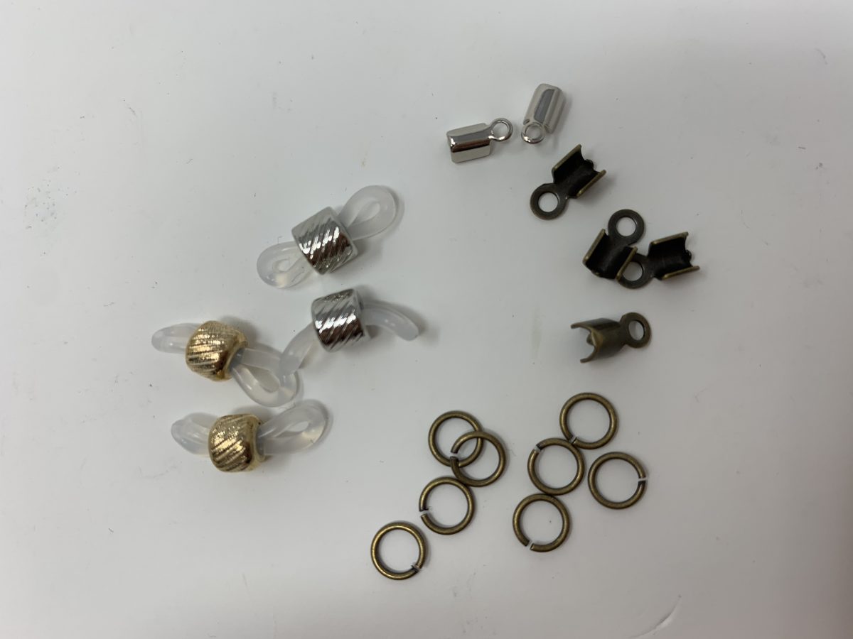 必要な金具は3種類。右上から、ヒモ止め、丸カン、メガネホルダー