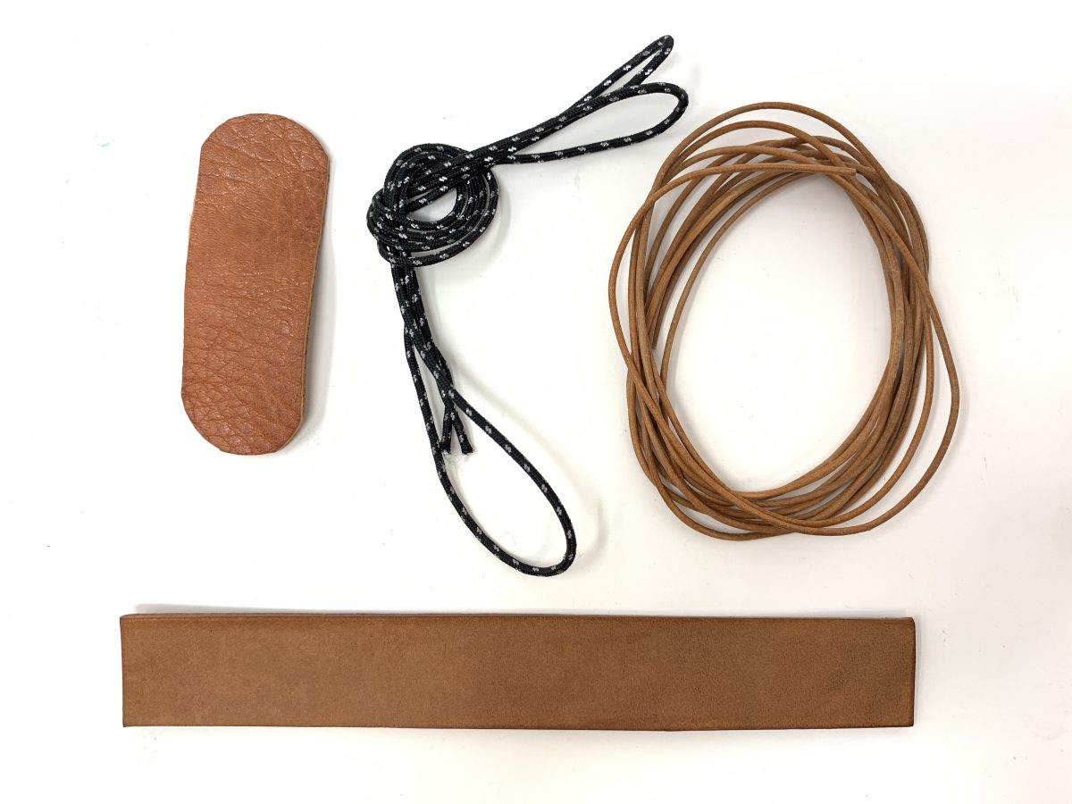 今回用意した材料は、牛革、本革のコード、細引き。パラコードもおすすめ