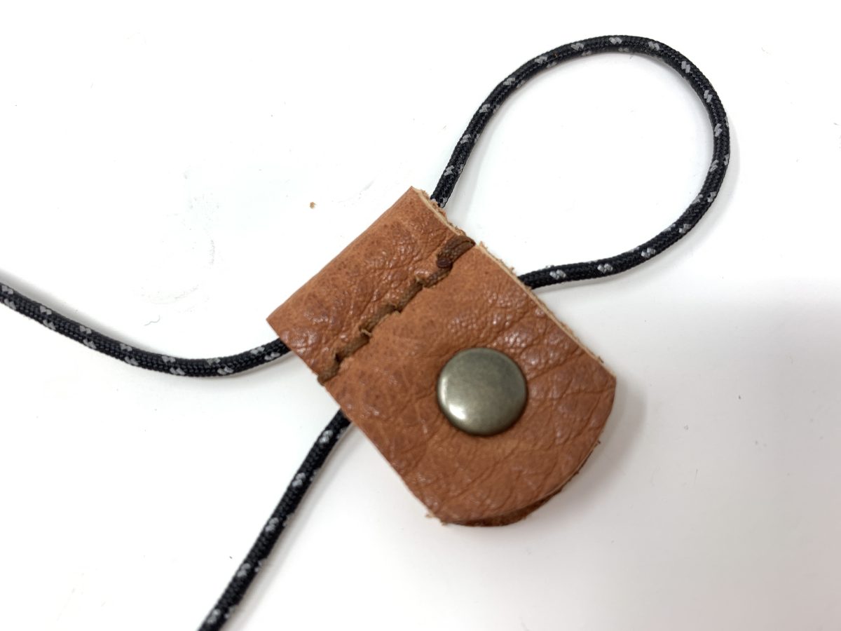 適当にカットした革を半分に折り、コードがとおるギリギリのところで縫い留めました。さらにアクセントに両面ハトメで閉じています。革の裏面はボサボサのままの方がコードがほどよく引っかかっていい感じです。