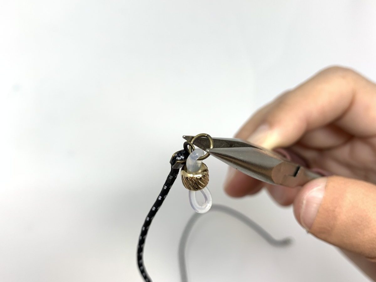 2.メガネホルダーと革ひもをつなぐのは丸カン。少し間を広げる