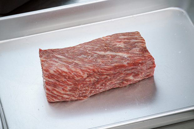 クーラーから取り出してすぐは、塊肉の芯はかなり冷たい。調理前にしばらく外に出しておき、常温になってから焼き始めると生焼けになる失敗が少ない。