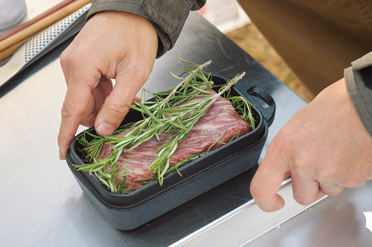 2.牛肉を覆うようにたっぷりとローズマリーを入れ、フタをして上下火でローストする。