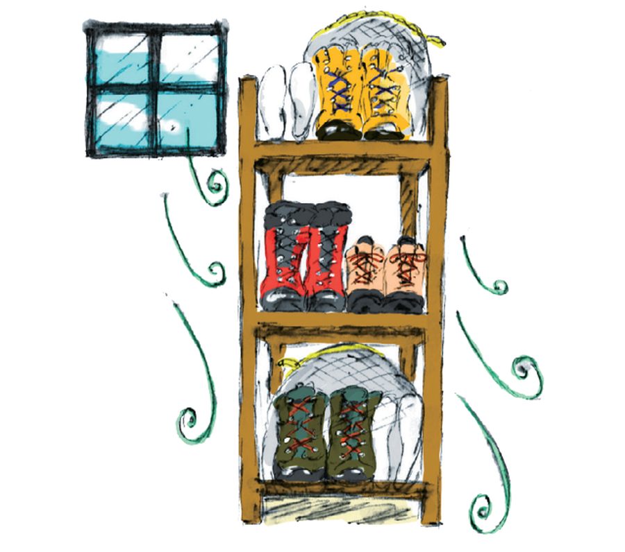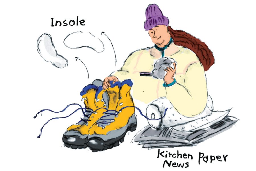 防臭の秘訣は内部の水分を早く取り除くこと。帰宅する前、下山してすぐにインソールを外してキッチンペーパーや新聞紙など水気を吸うものをとりあえずシューズに突っ込んでおこう。若干の臭いは一般的な消臭商品が有効だが、カビ臭は一度ついてしまうと完全な除去は不可能だ。そうならないように普段からメンテナンスをし、保管時はインソールを外し、湿気がたまりやすい場所に置かないなどの配慮しよう。