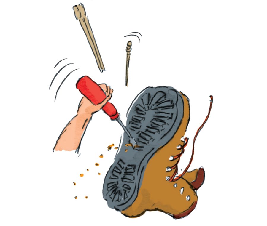 ソールは土中の成分で変質する場合があるので、汚れは可能な限り取り除きたい。ブラシで水洗いすれば大抵の汚れは落ちるが、その際、ソール以外の部分を不必要に濡らさないよう注意。小石などは割り箸やつまようじ、マイナスドライバーなどで取り除けるが、ソールを傷つけないよう配慮すること。パターンが細かいソールの詰まりには使い古しの歯ブラシも役に立つ。突起のついたシューズ用のメンテナンスブラシも便利だ。