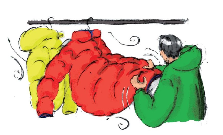 レインウエアと同様に直射日光に当てると紫外線で生地が劣化してしまうので、風通しのいい日陰を選び、太目のハンガーに吊るして干すようにしよう。中に入っているダウンまでしっかり乾いたら、玉になっている羽毛を両手で叩いてほぐしておく。