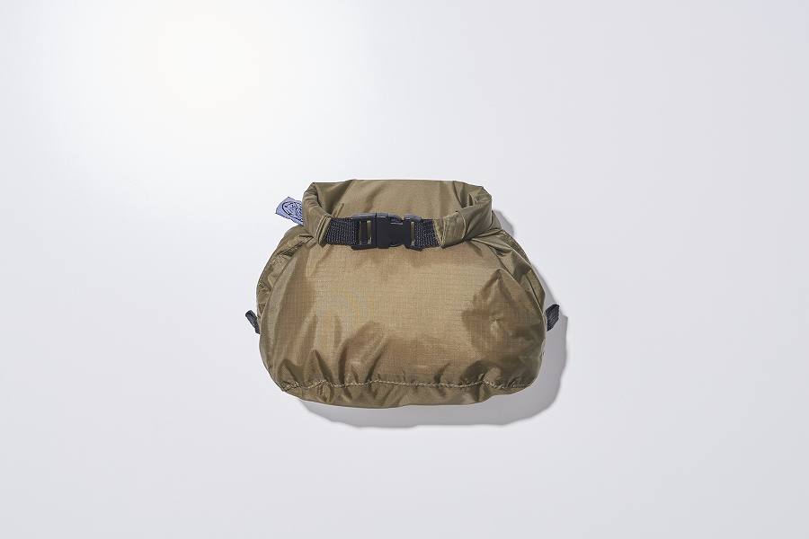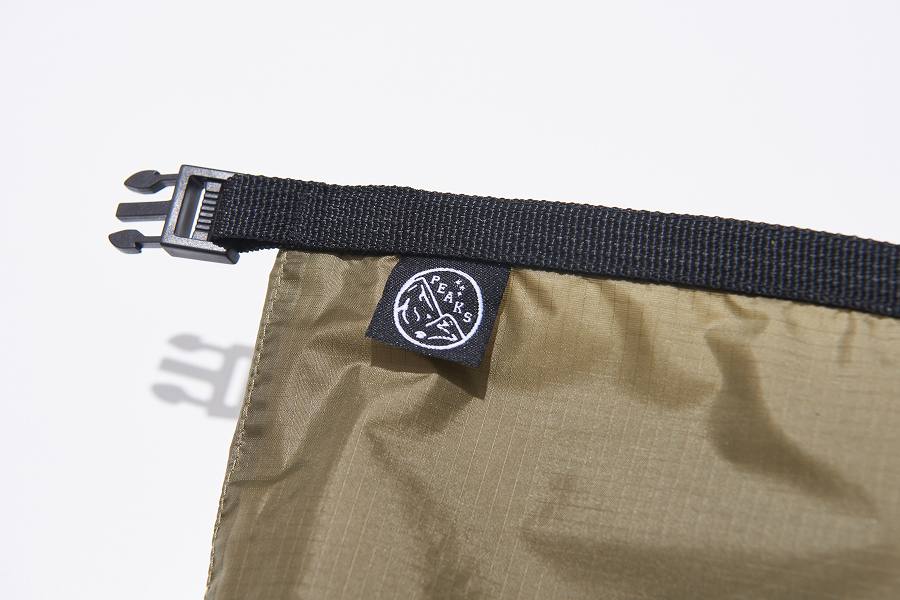 バッグの開口部は前回からの変更点、両側とも硬い心材を使用し、より巻き込みやすく改良しています。防水性を高めるには2回以上トップの開口部を巻き込んで、しっかり口を閉じてご使用を。『PEAKS』のロゴプリントタグ付き!