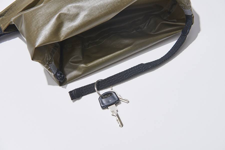 スナップボタンで開閉できるペーパーホルダーとしての役割を担う紐は、ギアループとしても使用可能。バッグのなかで失くしたくない鍵などの小物をひとまとめにできて便利ですよ。