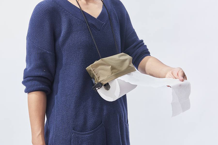 バッグの外側ボトムの両端に付いたループに紐を通せば首からぶら下げて使用することも可能です。こうやって使えばトイレットペーパーが取り出しやすく、登山中ちょっとトイレに……というときも、用をたしているところにうっかり落としてしまったりということも防げますね。暗闇のなかでのトイレ時にも安心です。