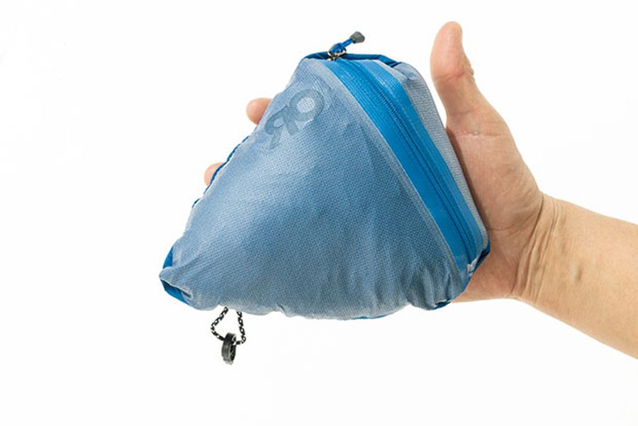 しなやかな薄手の生地は肌面立体加工を施した2.75レイヤー。肌離れを良くして悪天候時の低体温化を防ぐ。軽量でコンパクトに収納できるのも魅力で、パンツはウエスト内側に付けられたポケットに収納できる。